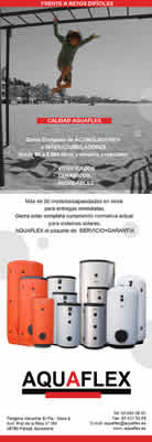 - Nuevas soluciones técnicas (dobles bocas de hombre, válvulas de seguridad, etc…). - Nueva línea nueva de colectores Standard y a medida hasta 5.800 Kw, completamente aislados. - Línea de Vasos de expansión en un único catálogo. Todos estos cambios y mejoras no han supuesto además cambios importantes en los precios, incluso muchos modelos han bajado sus precios, convirtiéndose de esta forma en más competitivos respecto al 2007! Si quisieran disponer del catálogo no duden en solicitarlo o incluso pueden descargarlo en pdf. En la web www.aquaflex.es |