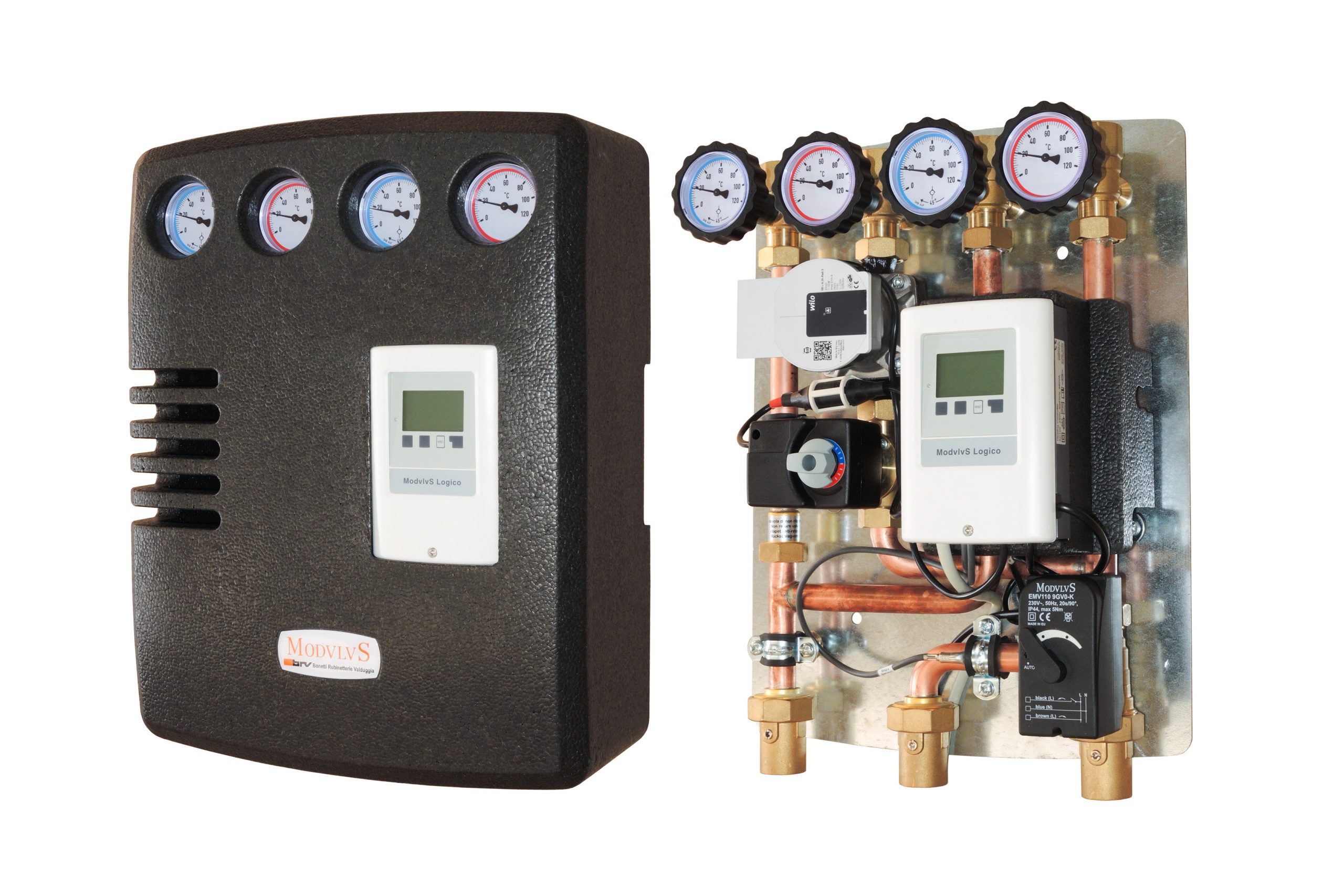 Módulo hidráulico compacto para a gestão de um circuito direto (alta temperatura), um misturado (piso radiante/baixa temperatura) e produção de água quente sanitária (AQS)